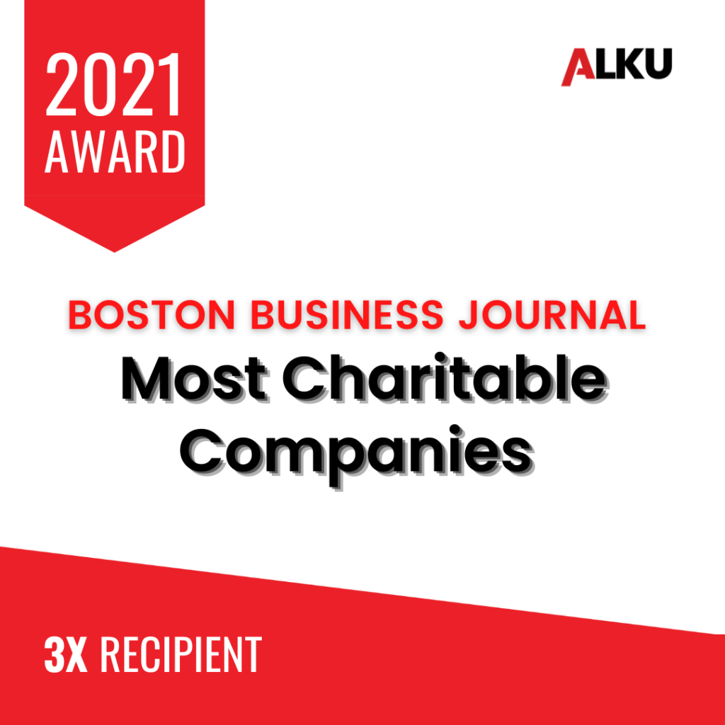 ALKU has been announced as a Boston Business Journal’s (BBJ) 2021 Top Charitable Contributor in Massachusetts. This is ALKU’s third year on this exemplary list, sharing the recognition alongside companies such as the Boston Bruins, Blue Cross Blue Shield, the Boston Red Sox, New Balance, and Tufts Medical Center. This annual list highlights companies that promote and prioritize giving back to their communities — a true testament of the time and resources dedicated during a year when the pandemic and social justice movements spurred companies to create new initiatives.